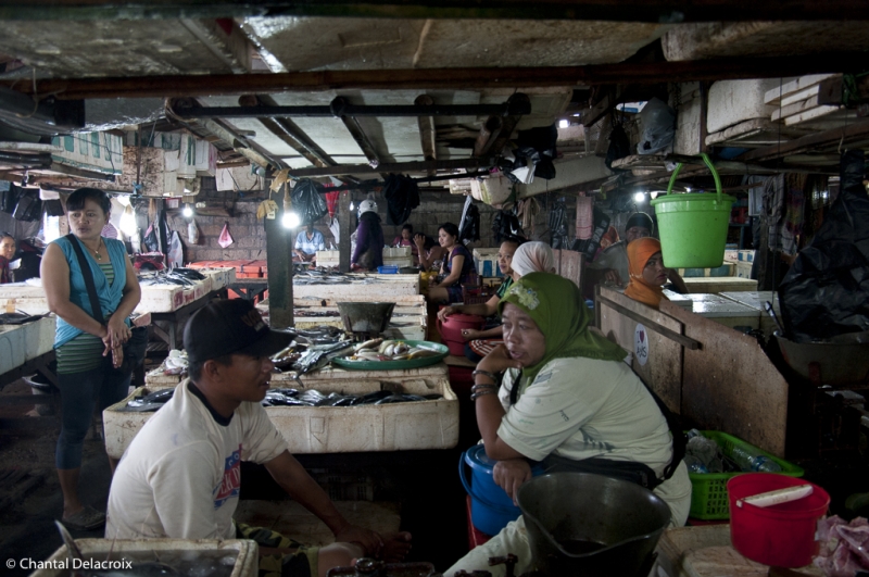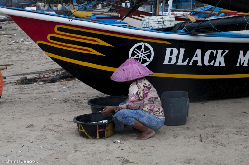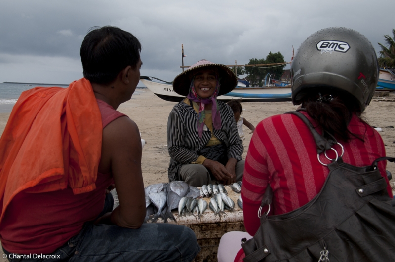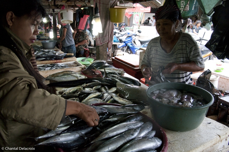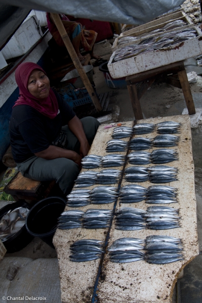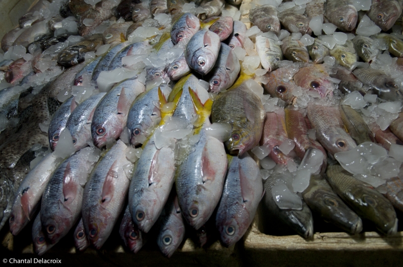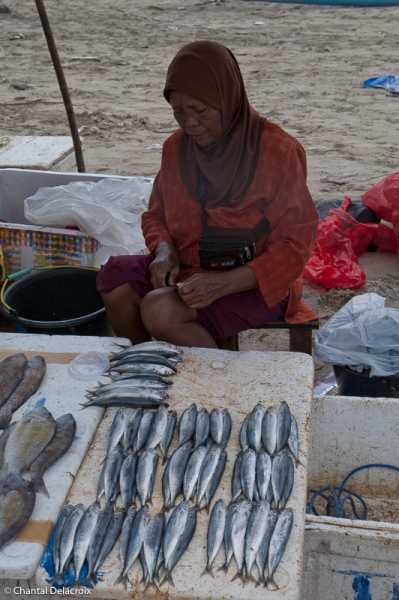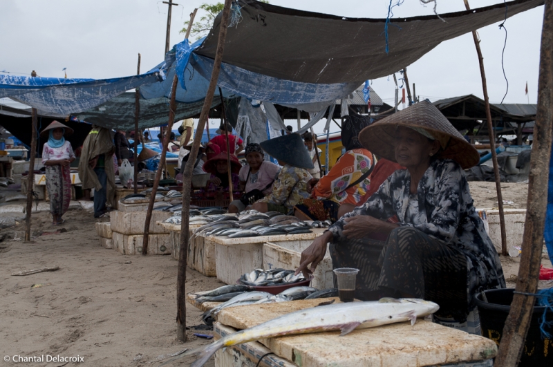Puis c’est le marché extérieur où quelques femmes de pêcheurs vendent la pêche du jour sur des étals à même le sol. Une grande variété de poissons, de mollusques et de crustacés. C’est frais, propre et appétissant. Rangement méthodique par petits tas qui doivent correspondre à la quantité minimale d’achat. Une véritable peinture, kaléidoscope, qui enchante Chantal.
